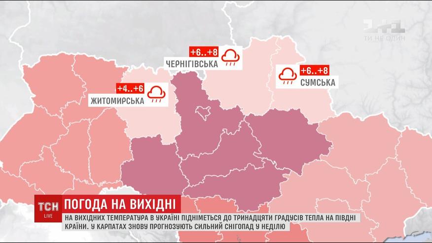 У суботу та неділю західних областях та в центральному регіоні дощитиме, синоптики обіцяють трохи мокрого снігу. Та в Карпатах у ніч проти неділі прогнозують сильний снігопад. А от у південних регіонах має бути сухо. У Гідрометцентрі кажуть, що до кінця тижня термометри в усій Україні показуватимуть від 6 до 12 градусів тепла вдень.