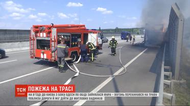 По обіді на в'їзді у столицю просто під час руху спалахнула фура. Інші кермувальники кинулися допомагати вогнегасниками, але без пожежних не обійшлося. Знадобилося три бригади, бо вогонь перекинувся на траву поряд із трасою і міг дійти до житлових будинків. Люди не постраждали, але на трасі утворився чималий затор. Причини займання водій не знає, небезпечного вантажу, каже, не віз.