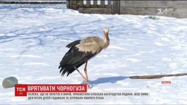 Знесиленого птаха прихистила багатодітна сім’я Осадчуків. Цілісіньку зиму дев’ятеро дітей годували та зігрівали хворого чорногуза. Аби тепер, навесні, він уже сильний та здоровий зустрів своїх родичів із вирію.