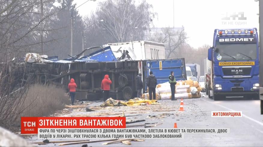 На Житомирщині фура зіштовхнулася з двома вантажівками, злетіла у кювет та перекинулася
