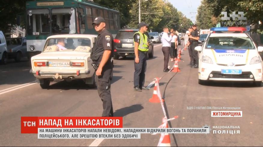 Поліція просить водіїв, які зранку проїжджали повз місце злочину, надсилати відео з реєстраторів. В центрі Житомира зловмисники накинулись на поліцейських охорони, коли ті виносили сумку з грошима з магазину. Нападники стріляли і поранили поліцейського в ногу.