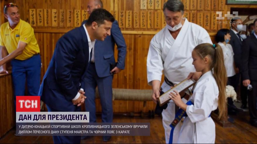 У Черкаси Зеленський завітав уже в новому статусі володаря чорного пояса з карате. Напередодні, у Кропивницькому Президент відвідав Обласну спеціалізовану дитячо-юнацьку школу олімпійського резерву. Він побував на тренуванні дітей з карате. Після завершення заняття вихованці школи подарували Зеленському диплом почесного першого дану ступеня майстра та іменний чорний пояс з вишитим прізвищем Глави держави японською мовою та назвою виду спорту – традиційне карате.
