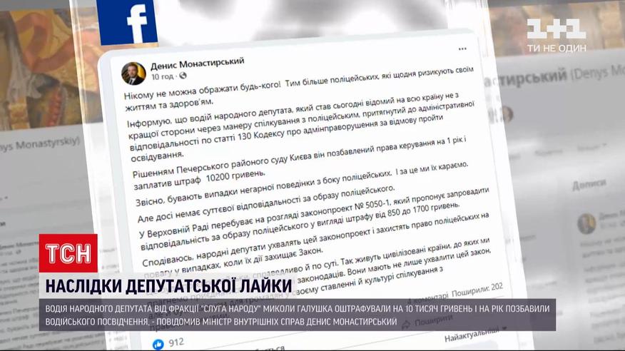 Водія народного депутата від фракції "Слуга народу" Миколи Галушка оштрафували на 10 тисяч гривень і на рік позбавили водійського посвідчення. Про це на своїй сторінці у Facebook повідомив міністр внутрішніх справ Денис Монастирський.