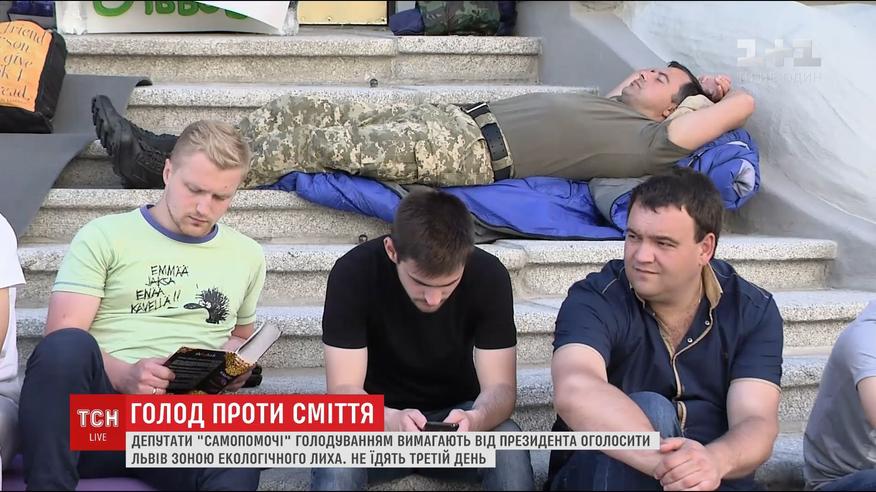 Щоправда, ТСН застала на голодному посту лише голову парламентської фракції "Самопоміч" Олега Березюка. Зате приїхали 20 людей з Кропивницького, Полтави, Франківська – підтримати протест проти ігнорування львівської сміттєвої проблеми. Але вони голодувати не збираються.