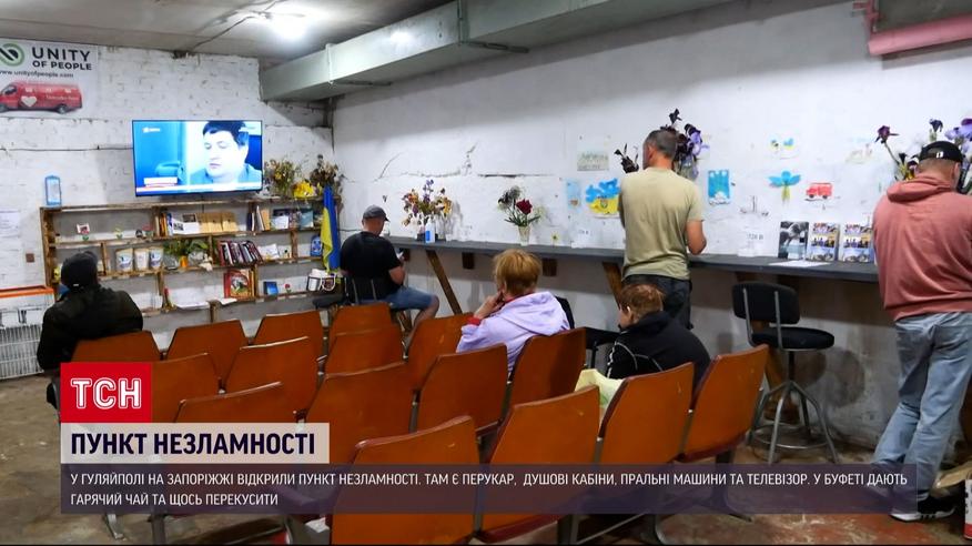 Перший "Пункт незламності" запрацював у Гуляйполі на Запоріжжі. Тут місцеві можуть скористатися послугами перукаря, є душові кабіни, пральні машини та кімната для відпочинку. Люди радіють навіть телевізору, який не дивилися більше року, бо не мали електрики. У буфеті можна випити чаю та перекусити. Відкрити «Пункт незламності» допомогли волонтери.