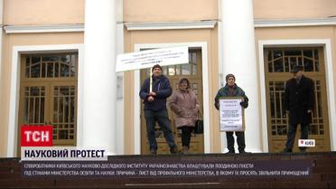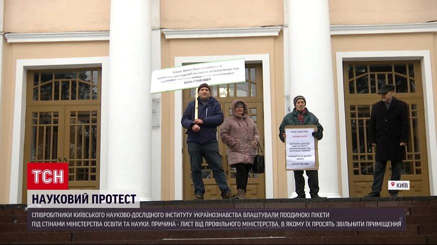 Науковці - на вихід! Співробітники київського науково-дослідного інституту українознавства влаштували поодинокі пікети під стінами Міністерства Освіти та науки! Причина - лист, який їм надійшов від профільного міністерства. В ньому йдеться про реорганізацію та про прохання звільнити приміщення, в якому ті пропрацювали близько 30 років. За словами працівників профспілки, їх, через брак коштів начебто хочуть об'єднати із якоюсь іншою освітньою установою. А в цьому вони вбачають неминуче скорочення колективу. І тому закликають міністра освіти Оксена Лісового до діалогу! Аби той дослухався до їхніх аргументів і відхилив рішення про реорганізацію науково-дослідного інституту українознавства. Однак до пікетувальників ні міністр, ні його заступники так і не вийшли. Деталі – в ТСН.