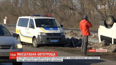 Смертоносна автотроща неподалік Харкова. Одразу чотири автівки перекинулися на дах. Одна з них перед цим в'їхала у людину. Жінка загинула, ще п'ятеро людей зазнали травм. Очевидці кажуть - саме на цій ділянці траси наприкінці зими аварії стаються щороку.