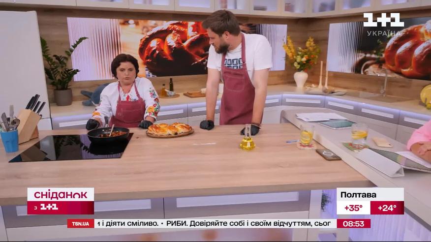 З Юлею заочно ми познайомились трохи раніше. Наш колега Руслан Сенічкін просив глядачів надіслати фото - з ким вони прокидаються. А потім пані Юля надіслала, як готує серпневі пироги разом з донечкою Таєю. Отже, Юля, і не сама, у цій студії вже за хвилину! Спочатку давайте познайомимось ближче! І разом з нею ми будемо готувати пиріг незалежності за фірмовим рецептом! Пиріг Незалежності Тісто 500 г Борошно 200 мл Кефір 1 шт. Яйце 10 г Дріжджі 30 г Вершкове масло 50 г Цукор Сіль Начинка Яблука Кориця Цукор Макова начинка Малина Крохмаль Цукрова пудра Випікати в духовці розігрітій на 180 градусів 35 хвилин. СМАЧНОГО!