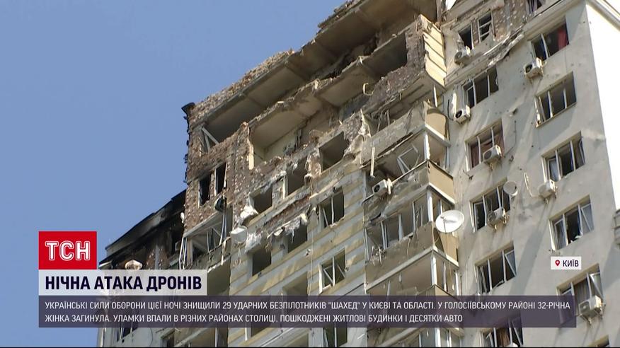 Уночі проти 30 травня росіяни атакували Київ 17-й раз за 30 днів травня. Українським силам оборони вдалося знищити 29 ворожих "Шахедів". Їх уламки впали у різних районах столиці, один з них вбив 32-річну жінку. Також пошкоджені кілька житлових та приватних будинків, кілька десятків автівок. Про нічну атаку та її наслідки – дивіться в матеріалі ТСН.