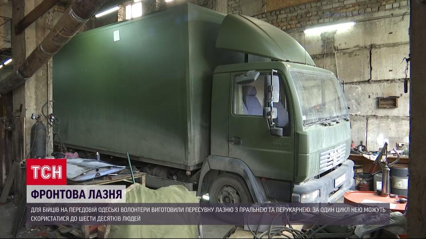 Пересувну лазню з пральнею та перукарнею виготовили в Одесі для бійців. 6 душових кабін, 3 пралки, баки на 2 тонни води. Воду гріють на дровах, а пральні машини працюють від генератора. Але є можливість під'єднувати пересувну лазню й до водогону та електромережі. Її облаштували на базі вантажівки. Ізсередини кузов обшили деревиною. Це вже друга лазня одеської автомайстерні. Кілька місяців тому тут виготовили парильню зі старої маршрутки. А в новій, удосконаленій, за один цикл можуть помитися до 60 військових.