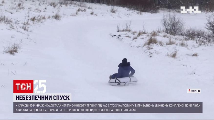 У Харкові 45-річна жінка отримала черепно-мозкову травму під час спуску на тюбінгу у приватному лижному комплексі. Як кажуть свідки, не впоралася з керуванням, вилетіла у замет і вдарилася головою. Поки люди кликали на допомогу, з траси на постраждалу впав ще чоловік на іншому тюбингу. Постраждала нині у реанімації в комі, медики прогнозів не дають. Родичі вже витратили на лікування понад 10 тисяч гривень. Сподівались на компенсацію від лижного комплексу, втім там на зв'язок не виходять.