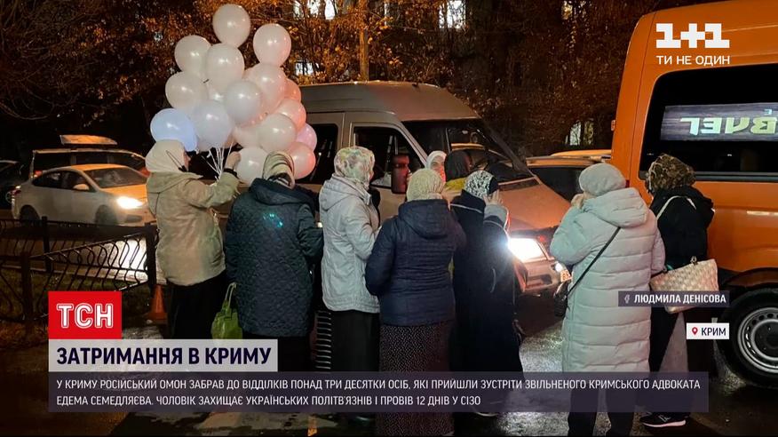 Російський ОМОН забрав до відділків понад три десятки людей. Серед них були жінки, журналісти та навіть неповнолітній. Вони прийшли зустріти з в'язниці адвоката Едема Семедляєва, який захищає політв'язнів. У сімферопольському СІЗО він провів 12 днів за незаконним обвинуваченням у непокорі окупантам. Затримали адвоката, коли він надавав юридичну допомогу політв'язням у справі "Хізб ут-Тахрір". А на виході з тюрми людей, які його зустрічали, - схопили окупанти та запроторили за ґрати. Декого відпустили, решту - збираються судити.