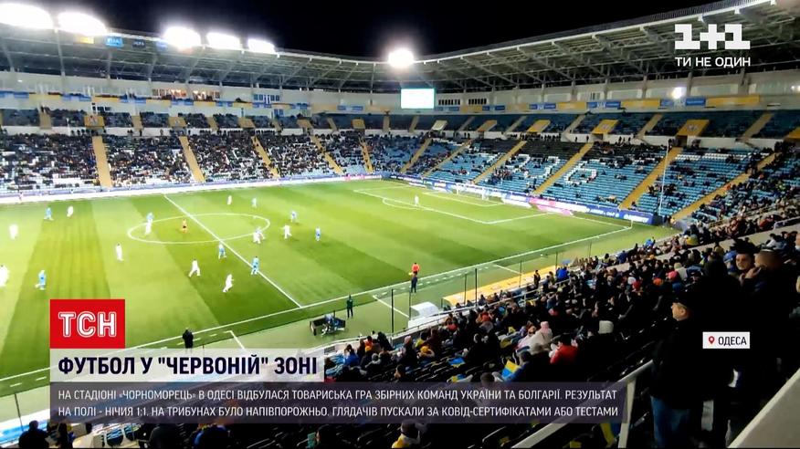 Футбольний матч у "червоній" зоні. В Одесі на стадіоні "Чорноморець" відбулася товариська гра збірних команд України та Болгарії. На трибунах було напівпорожньо. Через карантинні обмеження квитків у продаж надійшло вісімнадцять тисяч – це трохи більше половини місць стадіону. Але придбали їх і того менше людей – близько одинадцяти тисяч. У всіх глядачів на вході перевіряли наявність сертифікатів вакцинації.