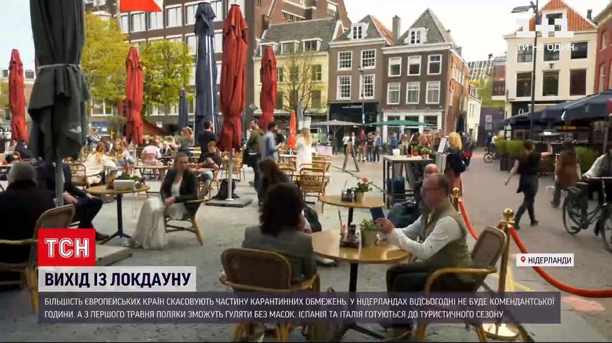 Кінець суворих локдаунів – більшість європейських країн скасовують значну частину карантинних обмежень. Відсьогодні у Нідерландах більше не буде нічної комендантської години. А з 1-го травня поляки зможуть гуляти без масок і ходити по ресторанах. Іспанія та Італія готуються до туристичного сезону – відкритись для іноземців, хоч і з паспортами вакцинації, планують уже в червні.