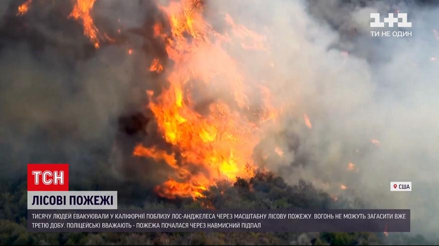 Понад тисячу американців евакуювали через пожежу, що шириться лісом неподалік Лос-Анджелесу в Каліфорнії. Поліцейські певні, що це підпал і шукають зловмисників. Вогонь лютує вже третю добу, подолати його заважає вітер та сухостій. Жертв удалося уникнути.