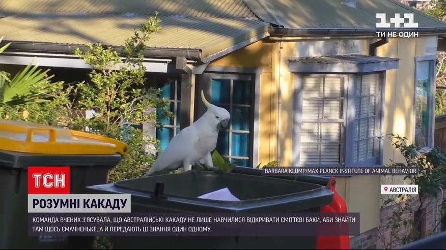 По їжу - до смітника. Команда світових вчених з'ясувала - австралійські какаду не лише навчилися відкривати сміттєві баки - а й передають ці знання один одному. Дослідники Інституту вивчення поведінки тварин зафільмували у Сіднеї, як птахи у кілька етапів відкидають кришки смітників. Аби потім понишпорити у них і знайти для себе щось смачненьке. Науковці попросили городян повідомляти, коли ті помітять какаду у смітниках.