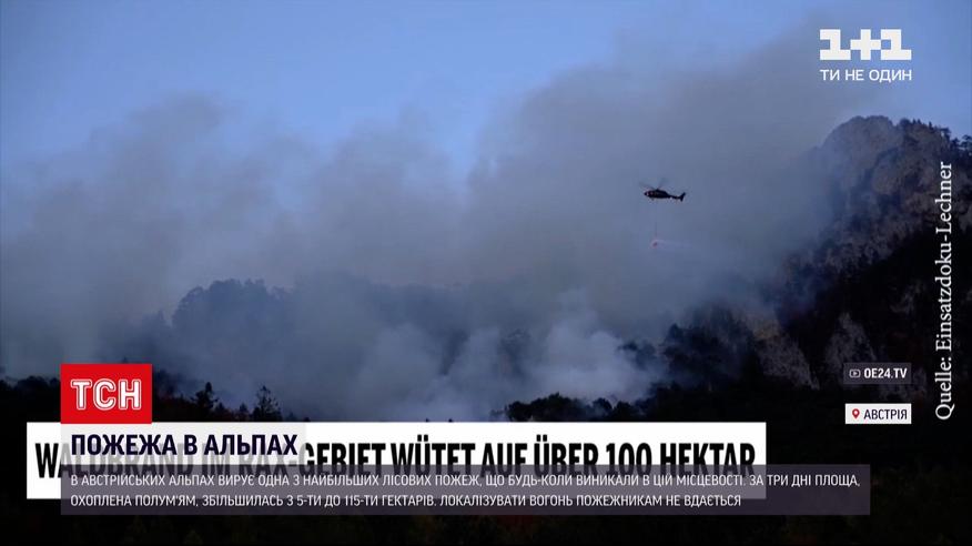 В австрійських Альпах вирує одна з найбільших лісових пожеж за всю історію цієї місцевості. За три дні площа, охоплена полум'ям, збільшилася з 5 до 115 гектарів. Локалізувати вогонь пожежникам не вдається. Місцевість практично непрохідна – наземній техніці вкрай важко дістатись гірського масиву. Пожежу намагаються загасити з повітря з 8 гелікоптерів.