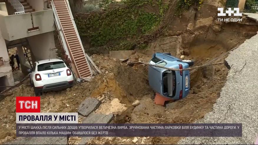 Всепоглинаюча стихія. На Сицилії після сильних дощів утворилася величезна вирва. Зруйнована парковка біля будинку та частина дороги. У провалля впало кілька машин. Обійшлося без жертв. Але місцеві побоюються, що наступним стихія може поглинути житловий будинок.