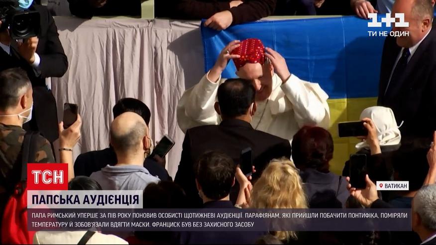 Вийшов у люди. Папа Римський уперше за півроку поновив особисті щотижневі аудієнції. Раніше через коронавірусні обмеження Франциск із вірянами спілкувався онлайн із бібліотеки Ватикану. Побачити Понтифіка сьогодні прийшли сотні парафіян, серед них навіть українські - вони взяли із собою синьо-жовтий прапор. Щоби потрапити на аудієнцію, вірянам необхідно було спершу пройти температурний скринінг й одягти маску.