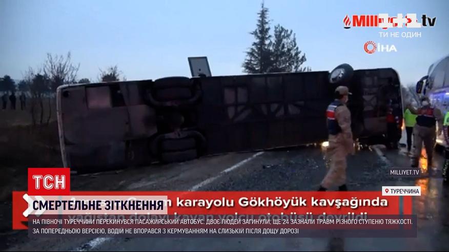 Пасажирський автобус перекинувся на півночі Туреччини. Двоє людей загинули. Ще 24 травмованих, стан деяких з них важкий. Аварія сталася рано-вранці на автомагістралі "Амасія-Чорум". Чи були серед пасажирів іноземці – наразі невідомо.