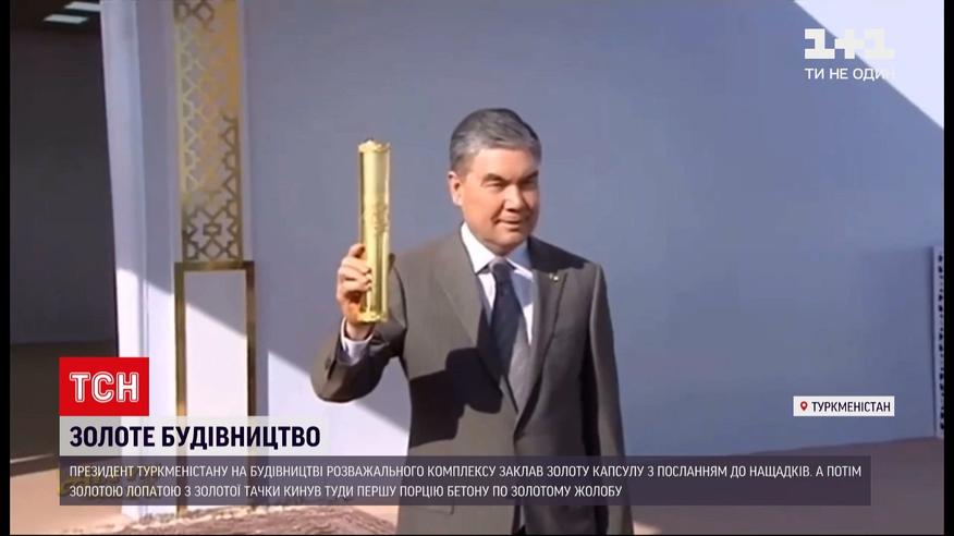 Золоте будівництво. Президент Туркменістану приїхав на будмайданчик розважального комплексу. Там він заклав золоту капсулу з посланням до нащадків. А потім золотою лопатою з золотої тачки кинув туди першу порцію бетону по золотому жолобу. Це все відбувалось під бурхливі оплески будівельників.