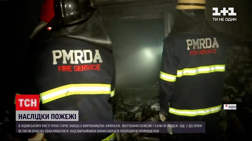 Полум'я стіною та їдкий дим. В індійському місті Пуна горів завод із виробництва хімікатів. Жертвами пожежі стали щонайменше 18 людей. Їхні тіла вдалося знайти, коли вже вогонь узяли під контроль пожежники. Іще зо два десятки людей встигли вчасно покинути небезпечну будівлю. Роботу рятувальники поки що на місці не припинили, там намагаються охолодити приміщення, кажуть - досі є загроза займання легкозаймистих хімікатів.