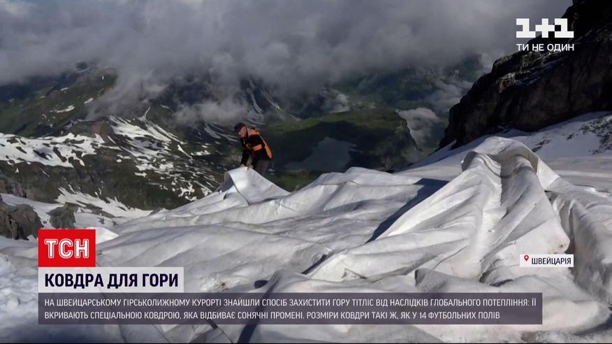 Ковдра для льодовика - на швейцарському гірськолижному курорті знайшли несподіваний спосіб боротися з наслідками глобального потепління. У теплу пору року гору Тітліс - одну з найбільш популярних у країні - вкривають спеціальною флісовою ковдрою. Щільна тканина відбиває сонячне світло. Все, аби вберегти кригу, котра вкриває гору, від танення. А ще збирає сніг, яким потім латають тріщини у льодовику. На те, аби розстелити ковдру, йде 5-6 тижнів, і ще стільки ж, аби згорнути.