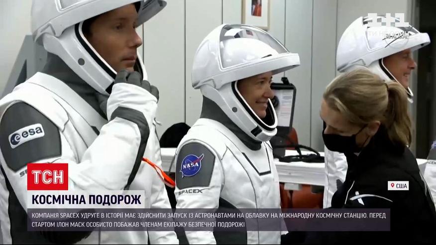 Подорож у космос. За лічені хвилини компанія SpaceX спільно з NASA має запустити на міжнародну космічну станцію 4 астронавтів. І це вже вдруге в історії запуск здійснюють із людьми на облавку на приватній ракеті. Стартувати вона має із космічного центру "Кеннеді", що у Флориді. "Екіпаж-2" - так охрестили цю місію. На борту - представники одразу трьох космічних агентств - американського, європейського та японського. Перед стартом власник SpaceX Ілон Маск особисто побажав їм безпечної подорожі.