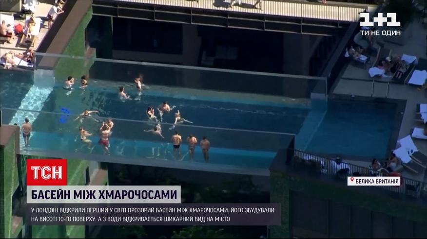 У Лондоні відкрили перший у світі басейн між двома хмарочосами. За розмірами це звичайний спортзальний басейн: 25 метрів завдовжки і 3 завглибшки. Тільки на висоті 10 поверху й повністю прозорий. В ньому залюбки купаються, адже у Великій Британії вже зовсім літня погода.