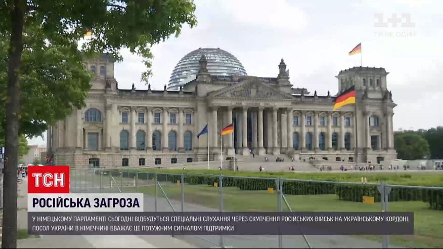 У німецькому парламенті сьогодні відбудуться спеціальні слухання через скупчення російських військ на українському кордоні. Посол України в Німеччині вважає це потужним сигналом підтримки і очікує, що позиція Бундестагу посприяє припиненню агресивних дій Російської федерації. Засідання заплановане на 15:40 за київським часом. Напередодні резолюцію на підтримку України ухвалили депутати польського сейму.
