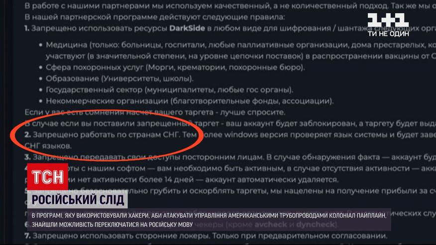 Ще один російський слід. У програмі, яку використовували хакери, аби атакувати управління американськими трубопроводами знайшли можливість переключатися на російську мову. Хакери продають свої шкідливі програми іншим, але просять не використовувати обладнання для нападів на медичні та освітні заклади, організації державного сектору і благодійні структури. А також забороняють працювати в країнах СНД. Через хакерський напад на Colonial Pipeline, що забезпечує пальним половину східного узбережжя Сполучених Штатів, підприємцям довелося сплачувати шантажистам близько 5 мільйонів доларів, аби відновити доступ до зламаної інфраструктури і відновити подачу бензину та дизельного палива.