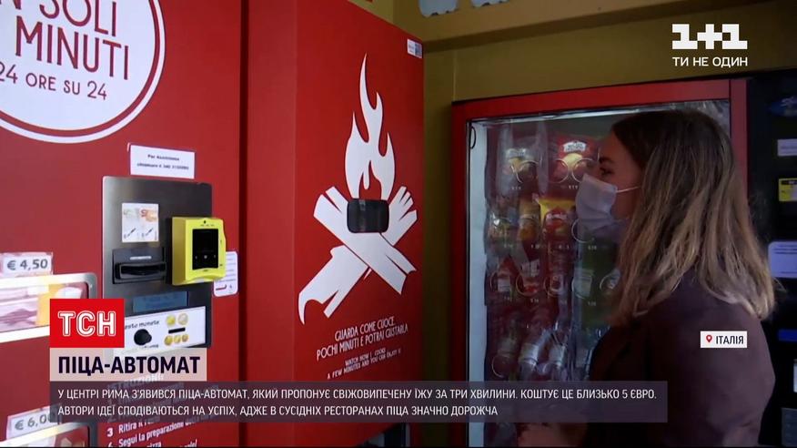 Піца-автомат з`явився в центрі Риму. Натиснути кілька кнопок, почекати 3 хвилини і все. Витягаєш свіжовипечену піцу середнього розміру в звичній картонній упаковці. Автомат пропонує на вибір: маргариту, чотири сири, гостру або з шинкою. Також можна додати напій – колу, сік або воду. І все разом це коштує близько 5 євро. Автори ідеї сподіваються на успіх, адже в сусідніх ресторанах за 5 євро продають хіба що шматочок.