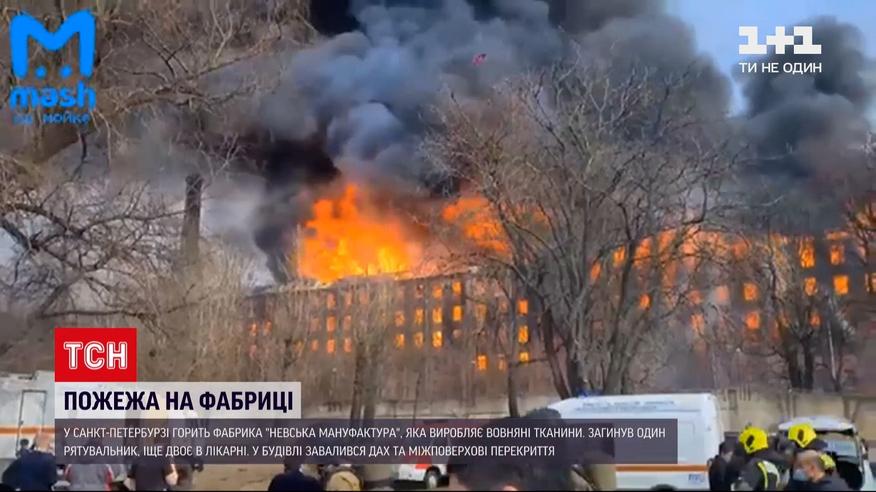 Сильна пожежа в Санкт-Петербурзі. Горить історична будівля фабрики "Невська мануфактура", яка виробляє вовняні тканини. Загинула щонайменше одна людина – це рятувальник. Іще двоє – в лікарні. Із будівлі вивели 40 працівників. На заводі завалився дах та міжповерхові перекриття. Вигоріли 10 тисяч квадратних метрів. Пожежа має найвищий ступінь небезпеки, до гасіння залучили 350 рятувальників та гелікоптери.