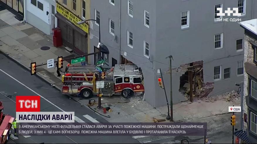 Протаранив будівлю наскрізь. В американському місті Філадельфія сталася аварія за участі пожежного авто. Щонайменше четверо вогнеборців і одна цивільна людина постраждали. Їх одразу забрали до шпиталю. Коли усе сталося, пожежна машина саме поспішала на виклик. Свідки кажуть - авто зачепило іншу припарковану вантажівку, а тоді влетіло у багатоповерхівку. Через аварію на нижньому поверсі будівлі утворилася величезна діра. Причини інциденту іще з'ясовуватиме слідство.