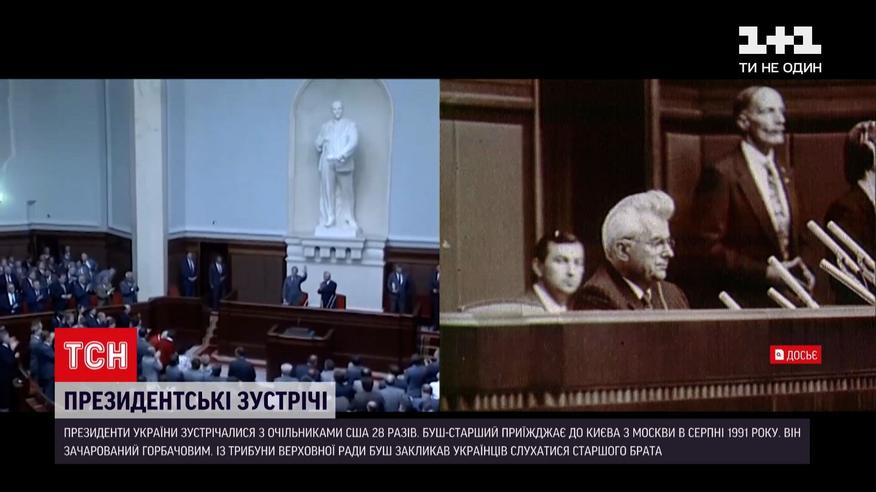ТСН підрахувала, що українські президенти зустрічалися з американськими 28 разів. Рекордсменом поки що залишається Леонід Кучма - він двічі приймав Білла Клінтона в Києві, а сам літав до нього аж 5 разів. Щоразу до таких зустрічей - особлива увага. Місце, час, порядок денний, деталі і навіть погляди - усе має значення. Від Кравчука до Зеленського, від Буша старшого і до Трампа - ТСН пригадала, як зустрічалися президенти.
