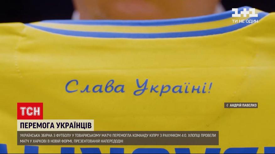 Перша перемога - у новій формі. Збірна України з футболу розгромила команду Кіпру із рахунком 4:0. Це була завершальна товариська гра перед стартом наших хлопців на Євро-2020. Матч у Харкові вони провели в новій формі, презентованій напередодні - із написами "Слава Україні" - "Героям слава" на комірі.