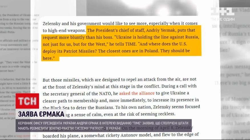 Україні бракує патріотів. Розмістити свої ракетні системи протиповітряної оборони "патріот" на території України пропонує Сполученим Штатам голова Офісу Володимира Зеленського. В інтерв'ю виданню "Тайм" Андрій Єрмак заявив таке: "Україна нині тримає лінію оборони проти Росії не лише для себе, а й за увесь Захід, відтак найближчі ракети системи "патріот" мають бути не у Польщі, а в Україні". "Патріоти" нині є на озброєнні армії США та країн-союзників.