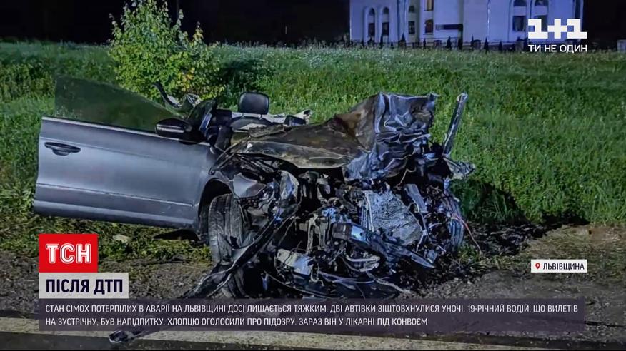 Стан сімох потерпілих, які постраждали в автотрощі у Львівській області, досі тяжкий. Троє з них у реанімації. У потерпілих множинні переломи, пошкодженні внутрішні органи. Дві автівки зіштовхнулися напередодні уночі. Компанія друзів поверталася з концерту у Бориславі додому в село. Їх було п'ятеро, за кермом 40-річний водій. В таксі, на шаленій швидкості, увігнався легковик. Його 19 річний водій був напідпитку і виїхав на зустрічну.
