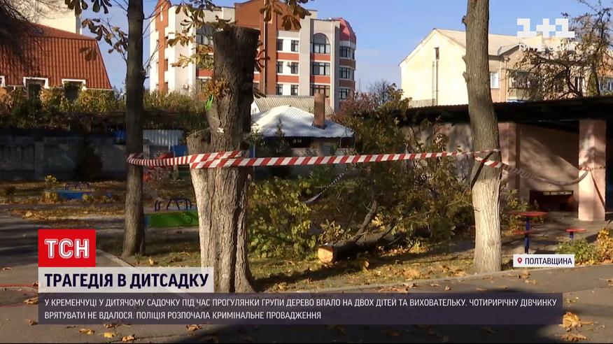 У дитсадку Кременчука Полтавської області дерево впало на двох дітей та виховательку. Чотирирічна дівчинка зазнала тяжкої травми голови. Попри всі зусилля, врятувати її медики не змогли. Чи можна було запобігти трагедії і який стан потерпілого хлопчика і виховательки - дізнавалася ТСН.