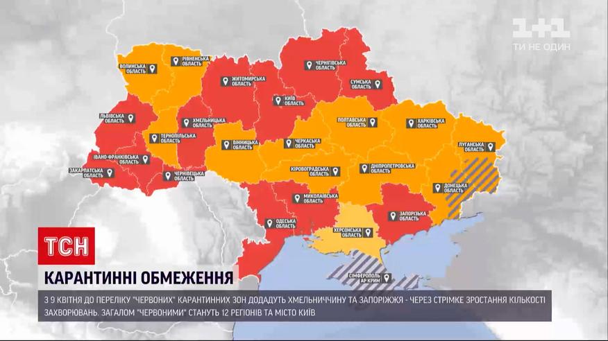 Плюс два регіони у червоній зоні. Вже від завтра "почервоніють" Хмельницька і Запорізька області - таке вирішила державна комісія. Тож від п'ятниці "червоними" в Україні будуть вже 12 областей та Київ. На час суворих карантинних обмеженнь будуть закриті ринки і магазини - окрім продовольчих, ресторани і кав’ярні працюватимуть тільки на виніс. З обмеженнями працюватиме громадський транспорт.
