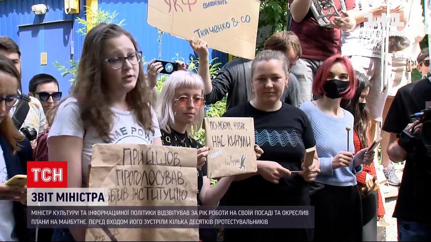 Гарячий прийом для міністра. Перед пресконференцією за результатами року на посаді очільника Мінкульту й інформполітики Олександра Ткаченка зустріли кілька десятків діячів культури. Гучним протестом вони вимагали від міністра втрутитися в ситуацію в Українському культурному фонді. Це організація, яка обирає, на які мистецькі проєкти виділити бюджетні кошти. Учасники акції твердять - в останні місяці Наглядова рада фонду без причин переписала результати конкурсів і профінансувала проєкти, які посіли нижчі місця в рейтингу.