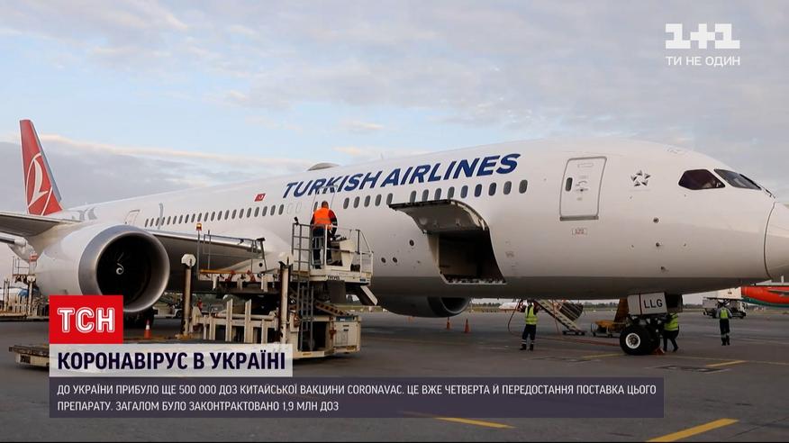 Іще пів мільйона доз вакцини прибуло до України. Нова партія китайського "Коронаваку" надійшла напередодні ввечері до аеропорту "Бориспіль". Зараз препарат уже проходить лабораторний контроль. І одразу по його закінченню вакцина роз'їдеться регіонами. Це була четверта та передостання поставка від китайського виробника. Усього законтрактовано майже 2 мільйони доз.