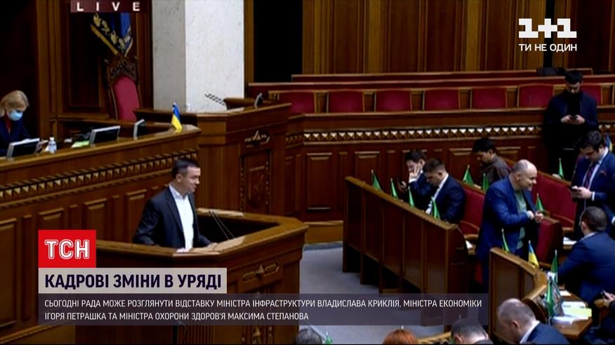 "Слуги народу" погодили кандидатури трьох нових міністрів. Про це на брифінгу парламентської фракції заявив її голова Давид Арахімія. Замість урядовців, які написали заяви власноруч - міністра інфраструктури Владислава Криклія пропонують голову "Укравтодора" Олександра Кубракова, а замість керівника мінекономіки Ігора Петрашко - голову ДПС Олексія Любченка. А от Міністром охорони здоров'я "Слуги народу" хочуть бачити головного санітарного лікаря Віктора Ляшка.