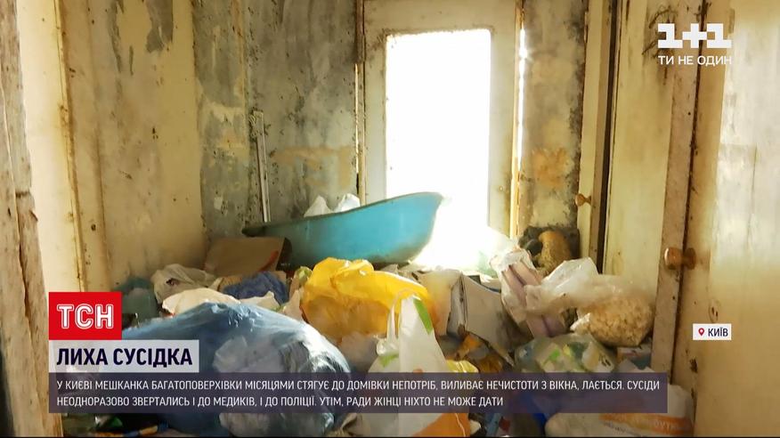 Виливає нечистоти із вікна, лається і живе в захаращеній квартирі із тарганами. У столиці жінка місяцями згрібає до домівки непотріб, інколи кидає його просто на голови перехожим. Сусіди неодноразово зверталися і до медиків, і до поліцейських. Втім, управи на жінку немає ніхто. Як припинити сусідський терор – дивіться далі.