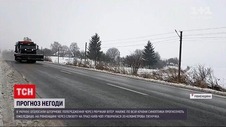 В Україні оголосили штормове попередження. Прихід теплого фронту циклону Elsa вже відчули на заході. Через ожеледицю в Рівненській області на трасі "Київ-Чоп" утворилася тягнучка завдовжки майже в 20 кілометрів. Водії наріють - на дорозі дуже слизько. Дорожники ж запевняють - постійно посипають шляхи спеціальнимми сумішами, та через накрапання дощу за мінусової температури - дороги знову підмерзають.