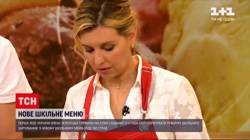Перша леді України на кухні "Сніданку з 1+1". До студії Олена Зеленська прийшла, щоби популяризувати започатковану нею реформу шкільного харчування. У прямому ефірі на телебаченні дружина президента з'явилася вперше. Разом із кулінарним експертом Євгеном Клопотенком вони приготували декілька страв. І розповіли: у новому шкільному меню буде 160 позицій.