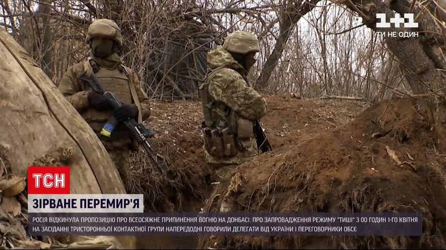 Перемир'я не буде. Росія відкинула пропозицію про всеосяжне припинення вогню на Донбасі. Про запровадження режиму повної тиші з 00 годин 1 квітня на засіданні тристоронньої контактної групи напередодні говорили і делегати від України, і переговорники з ОБСЄ. Війна на Донбасі в гарячу стадію перейшла після мінометного обстрілу російськими збройними формуванннями позицій українських військ 26-го березня. Тоді загинуло четверо бійців ЗСУ, ще двоє були поранені.
