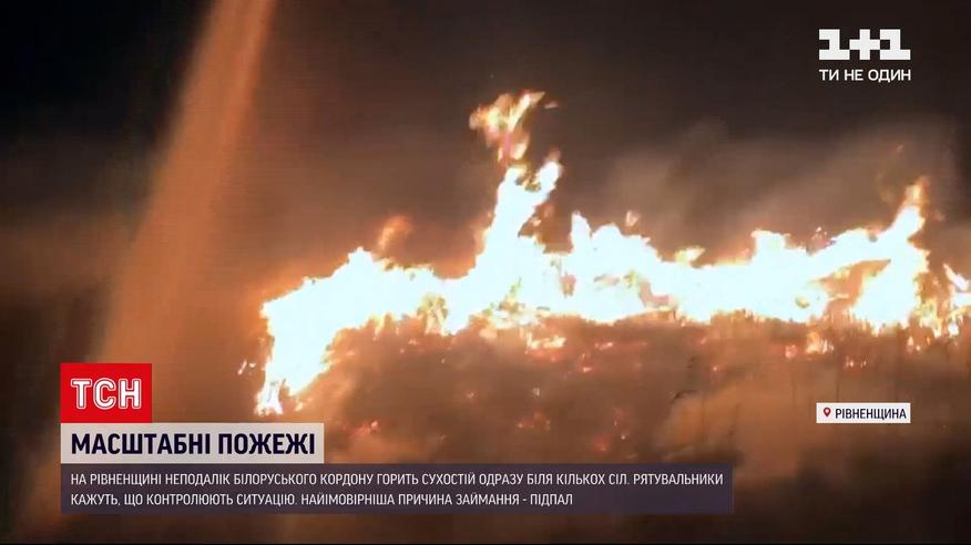 Маштабні пожежі в Рівненській області. У вогняній облозі опинились кілька сіл. Цілу ніч рятувальники, лісники та місцеві пожежні команди приборкували полум'я на 50 гектарах. Існувала загроза, що вогонь перекинеться на хати та ліс і пошириться до білоруського кордону. Щоб вогонь не перекинувся на житло людей та дерева – гасили без перестанку. Працювало понад два десятки одиниць техніки та понад 70 людей. Над ранок вогонь вдалось локалізувати, але повністю загасити його поки не виходить.