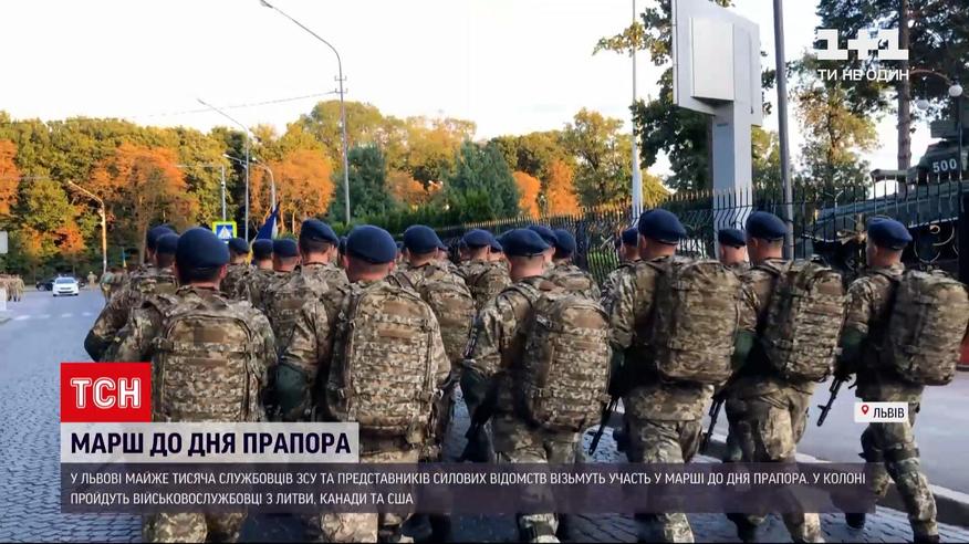 Рота почесної варти, нацгвардія, рятувальники і поліція. У Львові майже тисяча вояків Збройних сил та представників силових відомств візьмуть участь у Марші до дня прапора. У колоні пройдуть і військовослужбовці країн-партнерів - Литви, Канади та США. Напередодні учасники святкової ходи влаштували репетицію - дві години марширували вулицею поблизу академії сухопутних військ. Для цього частину дороги перекрили патрульні.