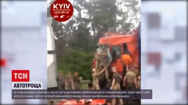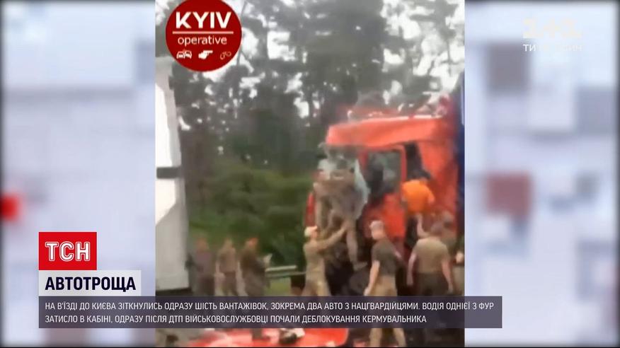 Шість вантажівок, серед яких два авто з нацгвардійцями, зіштовхнулись неподалік в'їзду до Києва на Бориспільській трасі. Очевидці зафільмували, як із найбільш понівеченої кабіни вантажівки одразу після ДТП гвардійці гуртом намагаються витягнути затиснутого в кабіні водія - ще до приїзду рятувальників, медиків та поліції. Згодом ДСНС деблокували кермувальника та передали його лікарям швидкої.